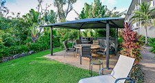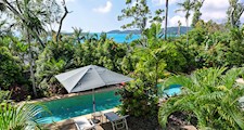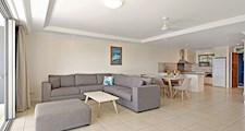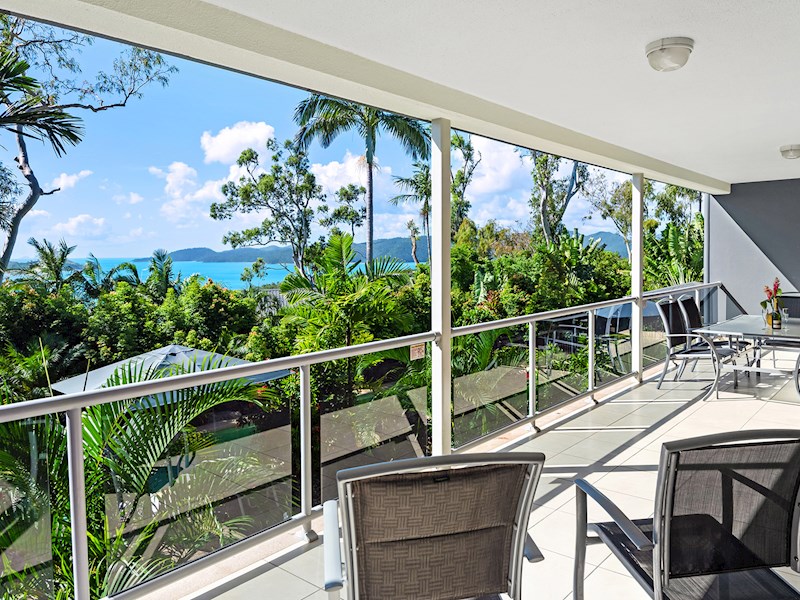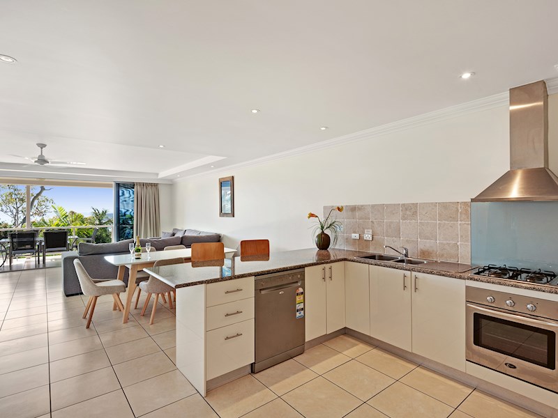 This apartment faces west, and offers beautiful views across the resort pool and gardens to the Whitsundays.