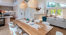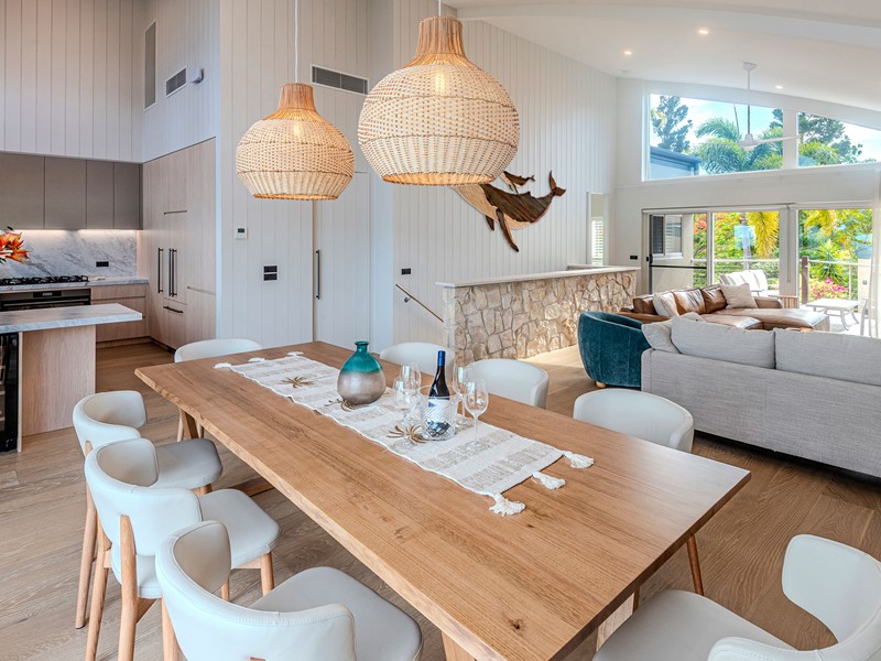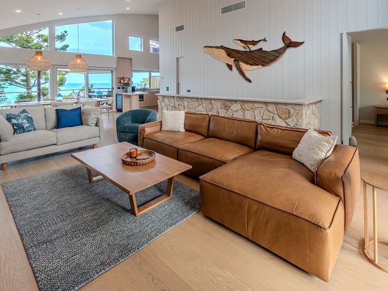 A fully equipped alfresco kitchen features an integrated BBQ, sink and bar fridge. The fully equipped kitchen features stainless steel appliances, an oven with integrated air fryer, Nespresso coffee machine, full utensils, crockery and cutlery. An additional inside bar fridge offers extra space for drinks and entertaining.