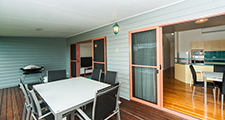 The open-plan, air-conditioned living area includes a flatscreen TV, complimentary Austar, a DVD player, corner lounge and a dining table for four people.