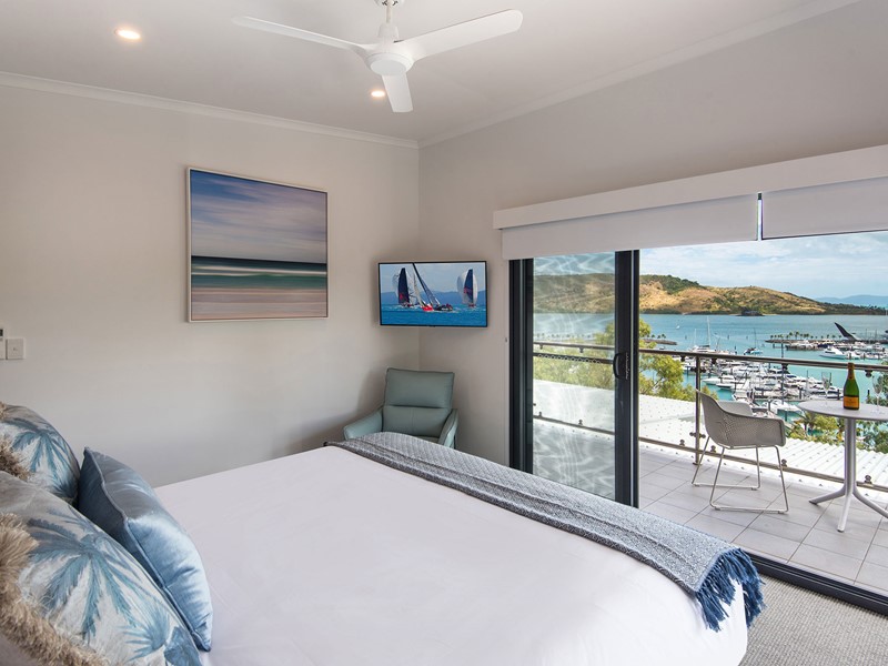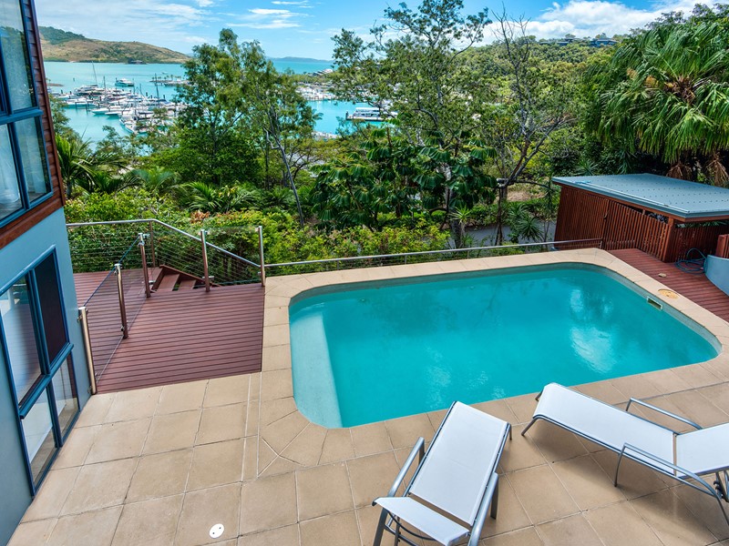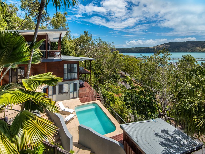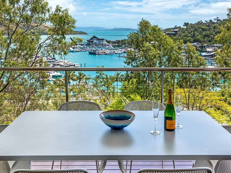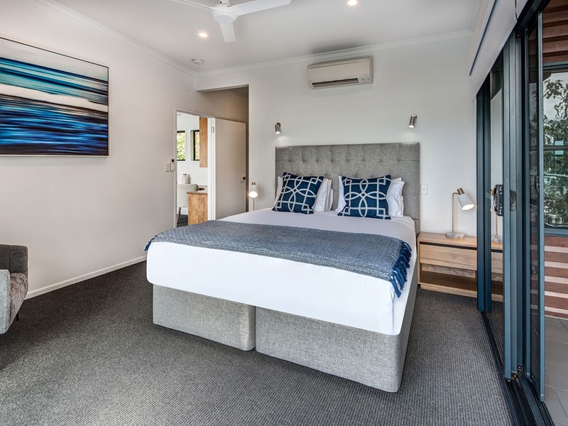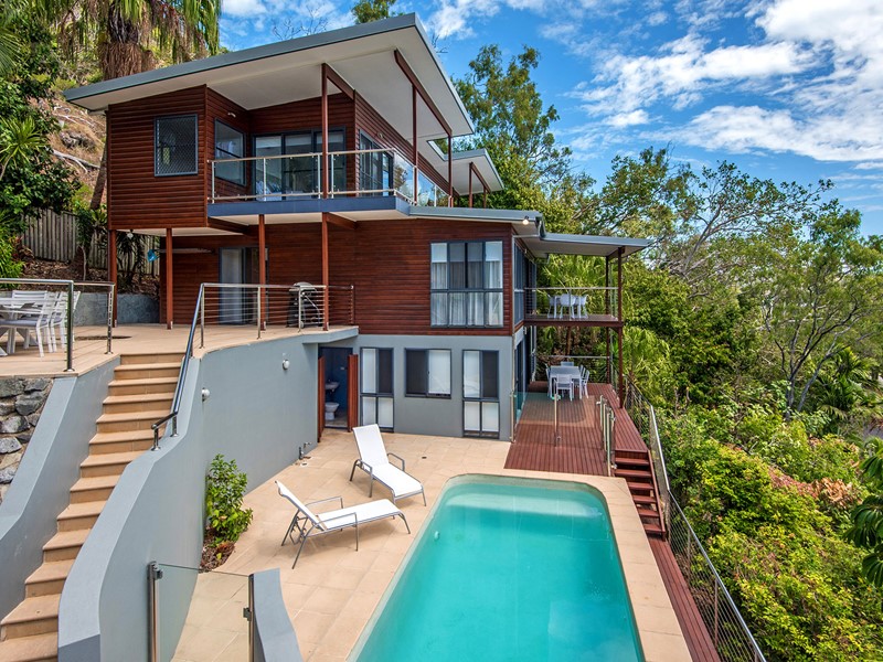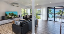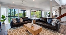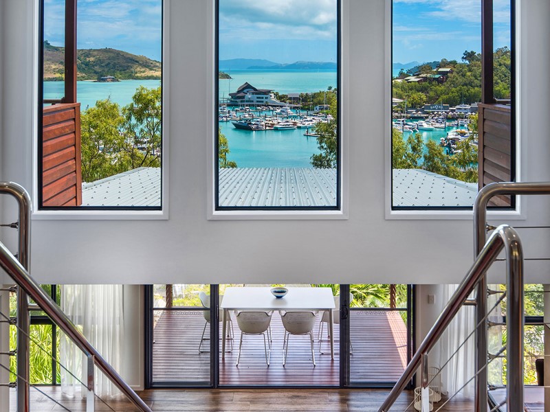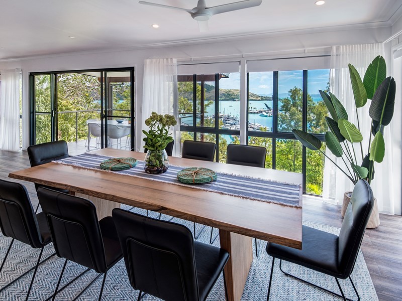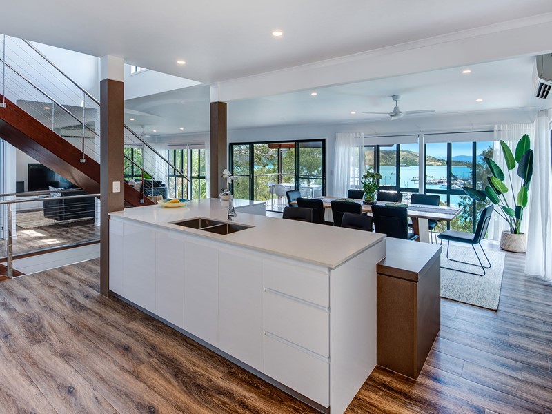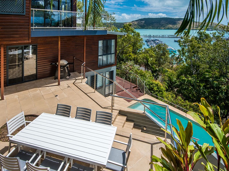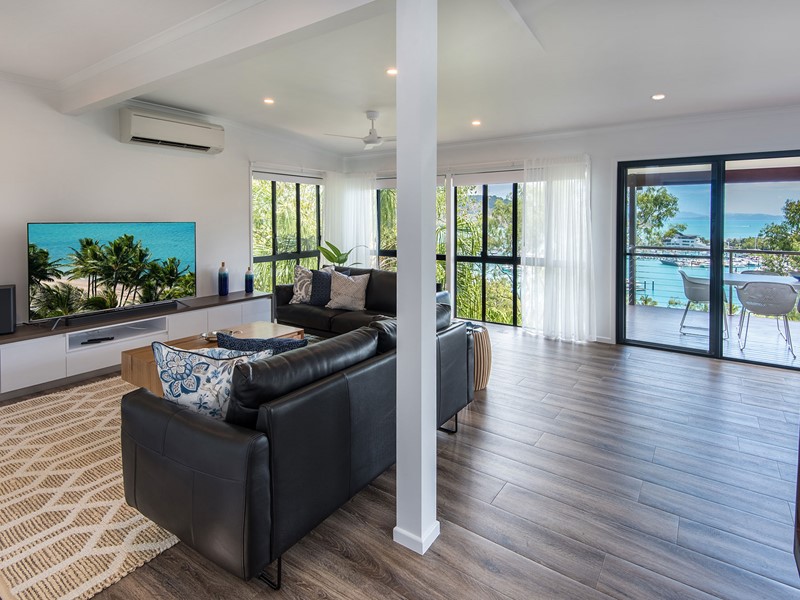This modern home offers an abundance of balconies from which to enjoy views of the Whitsunday waters. A large terrace flows from the main living area and features a BBQ and outdoor dining setting for eight people.