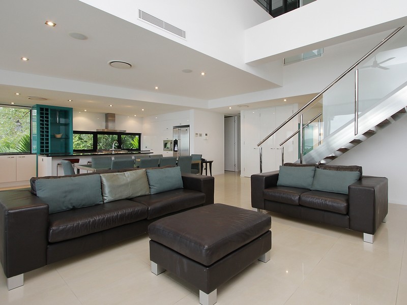 Upstairs, you'll find a spacious retreat with a separate lounge area, TV, private terrace and a king bed. This area also has views over Dent Passage, a private balcony, walk-in robe, and enormous ensuite. There's a double shower, separate toilet and even a spa, where you can take in the views.